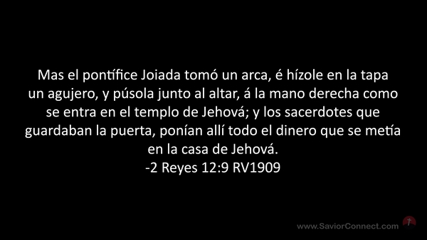 Mas el pontífice Joiada tomó un arca, é hízole en la tapa un agujero, y púsola junto al altar, á la mano derecha como se entra en el templo de Jehová; y los sacerdotes que guardaban la puerta, ponían allí todo el dinero que se metía en la casa de Jehová. -2 Reyes 12:9 RV1909