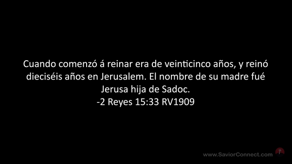 Cuando comenzó á reinar era de veinticinco años, y reinó dieciséis años en Jerusalem. El nombre de su madre fué Jerusa hija de Sadoc. -2 Reyes 15:33 RV1909