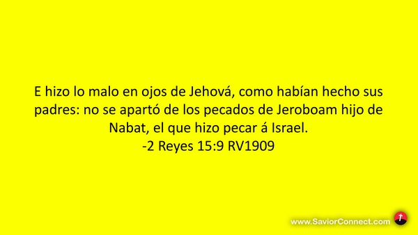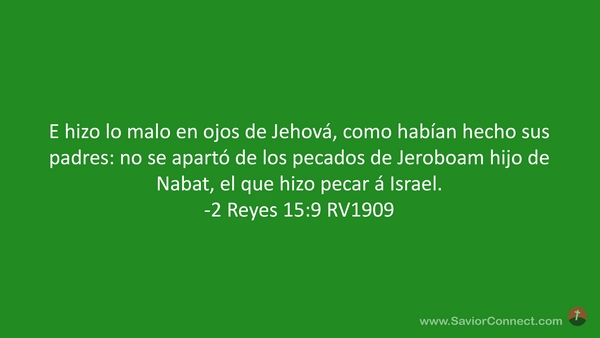 E hizo lo malo en ojos de Jehová, como habían hecho sus padres: no se apartó de los pecados de Jeroboam hijo de Nabat, el que hizo pecar á Israel. -2 Reyes 15:9 RV1909