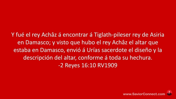 Y fué el rey Achâz á encontrar á Tiglath-pileser rey de Asiria en Damasco; y visto que hubo el rey Achâz el altar que estaba en Damasco, envió á Urías sacerdote el diseño y la descripción del altar, conforme á toda su hechura. -2 Reyes 16:10 RV1909