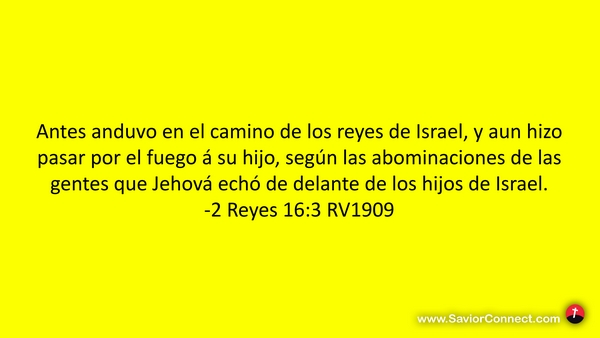Antes anduvo en el camino de los reyes de Israel, y aun hizo pasar por el fuego á su hijo, según las abominaciones de las gentes que Jehová echó de delante de los hijos de Israel. -2 Reyes 16:3 RV1909