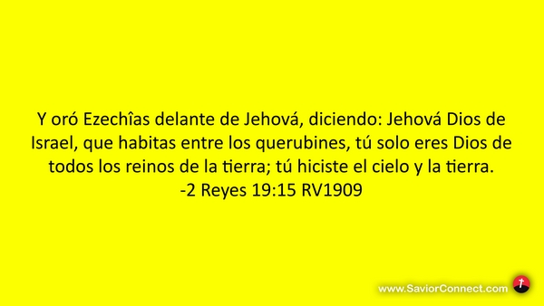 Y oró Ezechîas delante de Jehová, diciendo: Jehová Dios de Israel, que habitas entre los querubines, tú solo eres Dios de todos los reinos de la tierra; tú hiciste el cielo y la tierra. -2 Reyes 19:15 RV1909