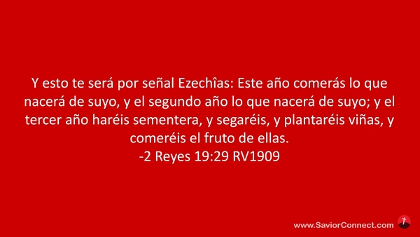 Y esto te será por señal Ezechîas: Este año comerás lo que nacerá de suyo, y el segundo año lo que nacerá de suyo; y el tercer año haréis sementera, y segaréis, y plantaréis viñas, y comeréis el fruto de ellas. -2 Reyes 19:29 RV1909