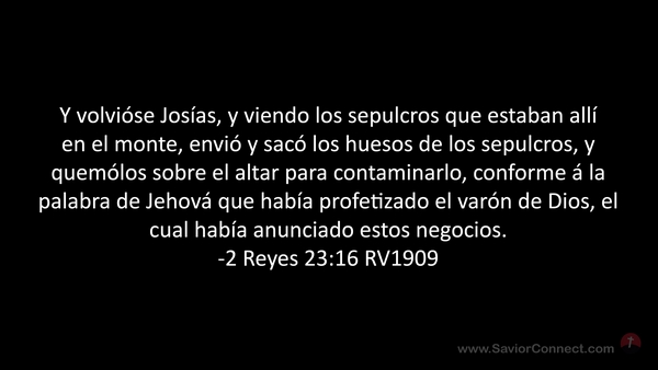 Y volvióse Josías, y viendo los sepulcros que estaban allí en el monte, envió y sacó los huesos de los sepulcros, y quemólos sobre el altar para contaminarlo, conforme á la palabra de Jehová que había profetizado el varón de Dios, el cual había anunciado estos negocios. -2 Reyes 23:16 RV1909
