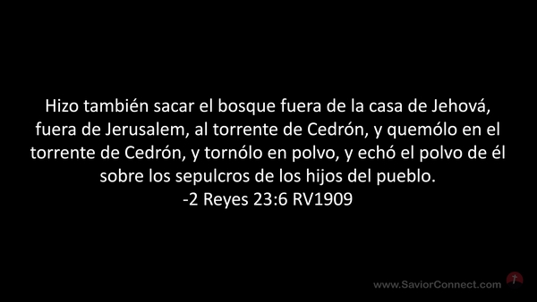 Hizo también sacar el bosque fuera de la casa de Jehová, fuera de Jerusalem, al torrente de Cedrón, y quemólo en el torrente de Cedrón, y tornólo en polvo, y echó el polvo de él sobre los sepulcros de los hijos del pueblo. -2 Reyes 23:6 RV1909