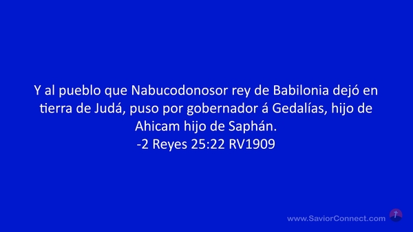 Y al pueblo que Nabucodonosor rey de Babilonia dejó en tierra de Judá, puso por gobernador á Gedalías, hijo de Ahicam hijo de Saphán. -2 Reyes 25:22 RV1909