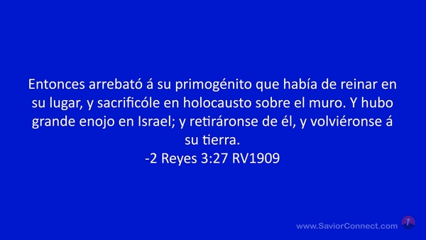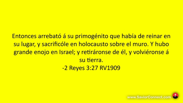 Entonces arrebató á su primogénito que había de reinar en su lugar, y sacrificóle en holocausto sobre el muro. Y hubo grande enojo en Israel; y retiráronse de él, y volviéronse á su tierra. -2 Reyes 3:27 RV1909