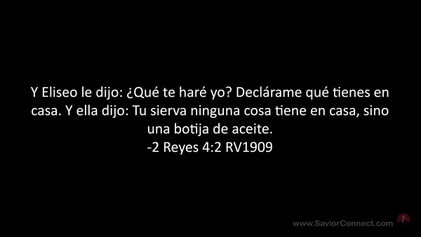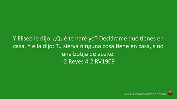 Y Eliseo le dijo: ¿Qué te haré yo? Declárame qué tienes en casa. Y ella dijo: Tu sierva ninguna cosa tiene en casa, sino una botija de aceite. -2 Reyes 4:2 RV1909