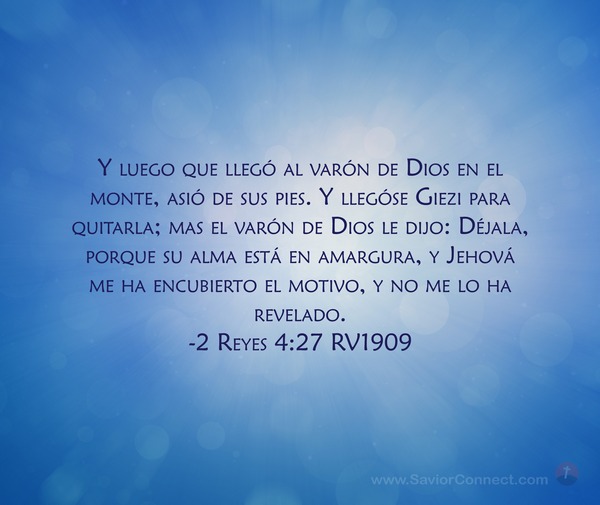 Y luego que llegó al varón de Dios en el monte, asió de sus pies. Y llegóse Giezi para quitarla; mas el varón de Dios le dijo: Déjala, porque su alma está en amargura, y Jehová me ha encubierto el motivo, y no me lo ha revelado. -2 Reyes 4:27 RV1909