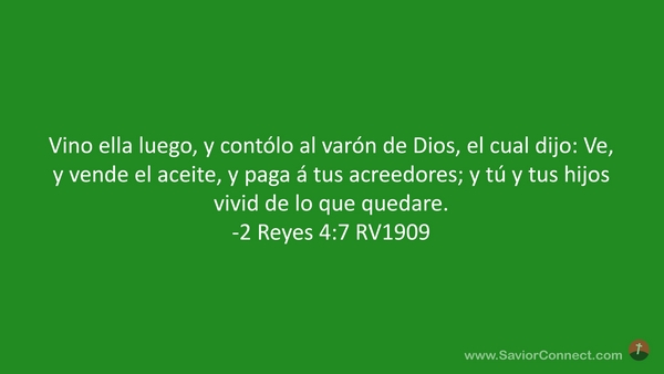 Vino ella luego, y contólo al varón de Dios, el cual dijo: Ve, y vende el aceite, y paga á tus acreedores; y tú y tus hijos vivid de lo que quedare. -2 Reyes 4:7 RV1909