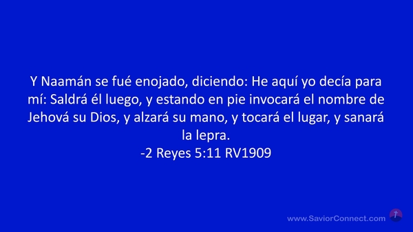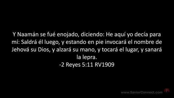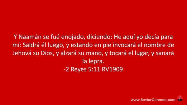 Y Naamán se fué enojado, diciendo: He aquí yo decía para mí: Saldrá él luego, y estando en pie invocará el nombre de Jehová su Dios, y alzará su mano, y tocará el lugar, y sanará la lepra. -2 Reyes 5:11 RV1909