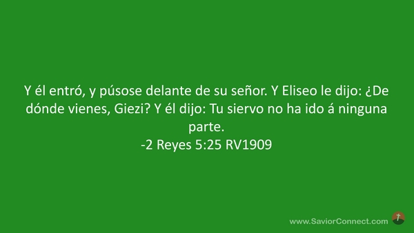 Y él entró, y púsose delante de su señor. Y Eliseo le dijo: ¿De dónde vienes, Giezi? Y él dijo: Tu siervo no ha ido á ninguna parte. -2 Reyes 5:25 RV1909