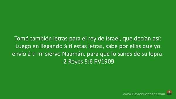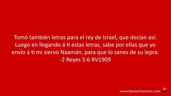 Tomó también letras para el rey de Israel, que decían así: Luego en llegando á ti estas letras, sabe por ellas que yo envío á ti mi siervo Naamán, para que lo sanes de su lepra. -2 Reyes 5:6 RV1909