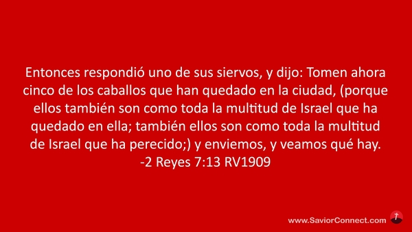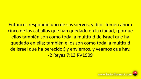 Entonces respondió uno de sus siervos, y dijo: Tomen ahora cinco de los caballos que han quedado en la ciudad, (porque ellos también son como toda la multitud de Israel que ha quedado en ella; también ellos son como toda la multitud de Israel que ha perecido;) y enviemos, y veamos qué hay. -2 Reyes 7:13 RV1909