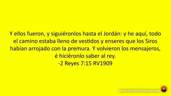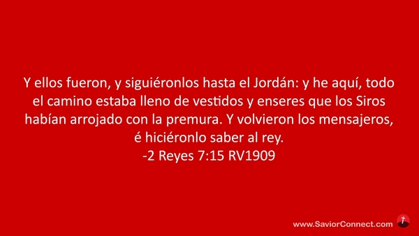 Y ellos fueron, y siguiéronlos hasta el Jordán: y he aquí, todo el camino estaba lleno de vestidos y enseres que los Siros habían arrojado con la premura. Y volvieron los mensajeros, é hiciéronlo saber al rey. -2 Reyes 7:15 RV1909