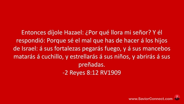 Entonces díjole Hazael: ¿Por qué llora mi señor? Y él respondió: Porque sé el mal que has de hacer á los hijos de Israel: á sus fortalezas pegarás fuego, y á sus mancebos matarás á cuchillo, y estrellarás á sus niños, y abrirás á sus preñadas. -2 Reyes 8:12 RV1909