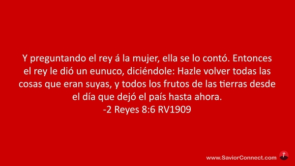 Y preguntando el rey á la mujer, ella se lo contó. Entonces el rey le dió un eunuco, diciéndole: Hazle volver todas las cosas que eran suyas, y todos los frutos de las tierras desde el día que dejó el país hasta ahora. -2 Reyes 8:6 RV1909