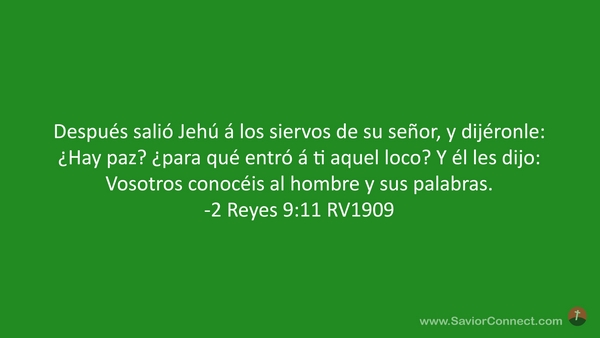 Después salió Jehú á los siervos de su señor, y dijéronle: ¿Hay paz? ¿para qué entró á ti aquel loco? Y él les dijo: Vosotros conocéis al hombre y sus palabras. -2 Reyes 9:11 RV1909