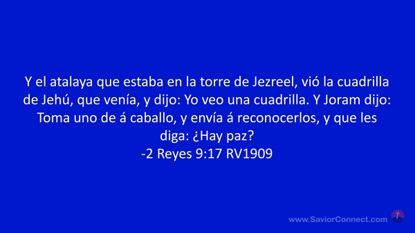 Y el atalaya que estaba en la torre de Jezreel, vió la cuadrilla de Jehú, que venía, y dijo: Yo veo una cuadrilla. Y Joram dijo: Toma uno de á caballo, y envía á reconocerlos, y que les diga: ¿Hay paz? -2 Reyes 9:17 RV1909