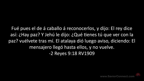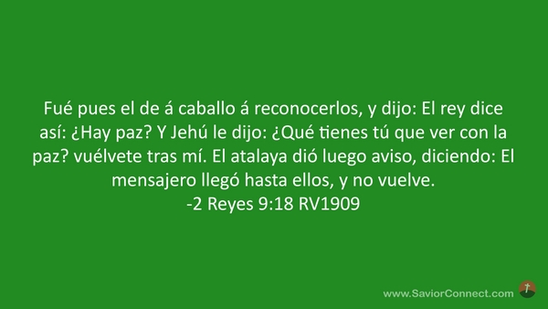 Fué pues el de á caballo á reconocerlos, y dijo: El rey dice así: ¿Hay paz? Y Jehú le dijo: ¿Qué tienes tú que ver con la paz? vuélvete tras mí. El atalaya dió luego aviso, diciendo: El mensajero llegó hasta ellos, y no vuelve. -2 Reyes 9:18 RV1909
