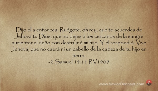 Dijo ella entonces: Ruégote, oh rey, que te acuerdes de Jehová tu Dios, que no dejes á los cercanos de la sangre aumentar el daño con destruir á mi hijo. Y él respondió: Vive Jehová, que no caerá ni un cabello de la cabeza de tu hijo en tierra. -2 Samuel 14:11 RV1909
