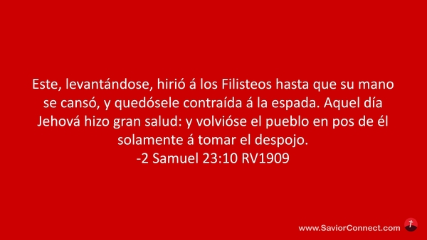 Este, levantándose, hirió á los Filisteos hasta que su mano se cansó, y quedósele contraída á la espada. Aquel día Jehová hizo gran salud: y volvióse el pueblo en pos de él solamente á tomar el despojo. -2 Samuel 23:10 RV1909