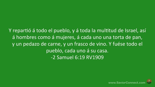 Y repartió á todo el pueblo, y á toda la multitud de Israel, así á hombres como á mujeres, á cada uno una torta de pan, y un pedazo de carne, y un frasco de vino. Y fuése todo el pueblo, cada uno á su casa. -2 Samuel 6:19 RV1909