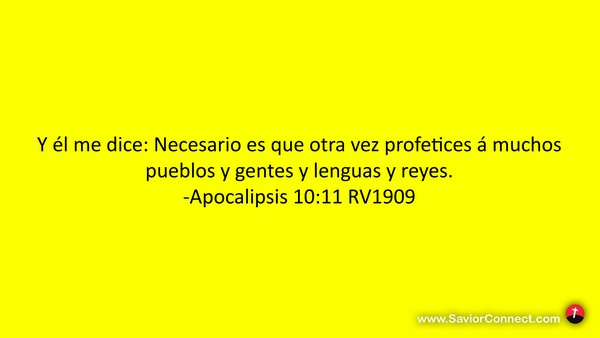 Y él me dice: Necesario es que otra vez profetices á muchos pueblos y gentes y lenguas y reyes. -Apocalipsis 10:11 RV1909