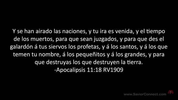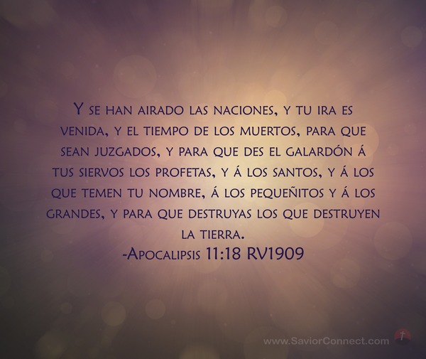 Y se han airado las naciones, y tu ira es venida, y el tiempo de los muertos, para que sean juzgados, y para que des el galardón á tus siervos los profetas, y á los santos, y á los que temen tu nombre, á los pequeñitos y á los grandes, y para que destruyas los que destruyen la tierra. -Apocalipsis 11:18 RV1909