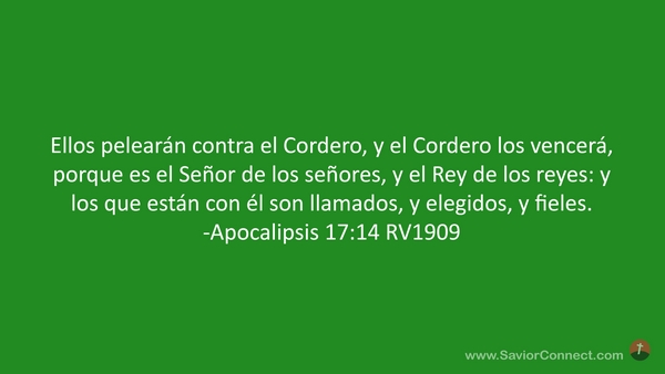 Ellos pelearán contra el Cordero, y el Cordero los vencerá, porque es el Señor de los señores, y el Rey de los reyes: y los que están con él son llamados, y elegidos, y fieles. -Apocalipsis 17:14 RV1909