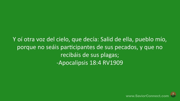 Y oí otra voz del cielo, que decía: Salid de ella, pueblo mío, porque no seáis participantes de sus pecados, y que no recibáis de sus plagas; -Apocalipsis 18:4 RV1909