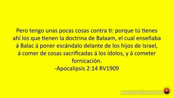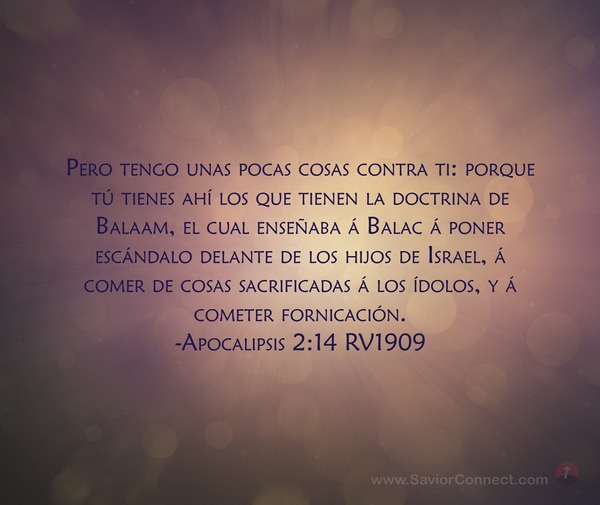 Pero tengo unas pocas cosas contra ti: porque tú tienes ahí los que tienen la doctrina de Balaam, el cual enseñaba á Balac á poner escándalo delante de los hijos de Israel, á comer de cosas sacrificadas á los ídolos, y á cometer fornicación. -Apocalipsis 2:14 RV1909