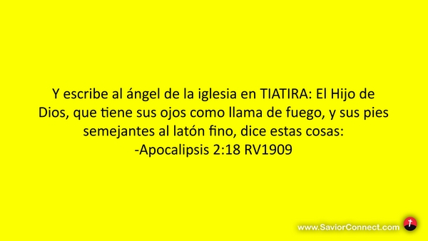 Y escribe al ángel de la iglesia en TIATIRA: El Hijo de Dios, que tiene sus ojos como llama de fuego, y sus pies semejantes al latón fino, dice estas cosas: -Apocalipsis 2:18 RV1909