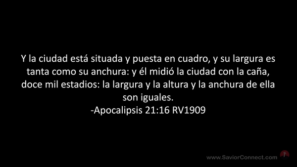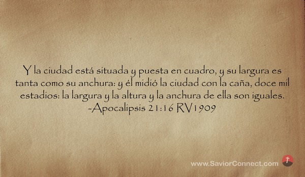 Y la ciudad está situada y puesta en cuadro, y su largura es tanta como su anchura: y él midió la ciudad con la caña, doce mil estadios: la largura y la altura y la anchura de ella son iguales. -Apocalipsis 21:16 RV1909