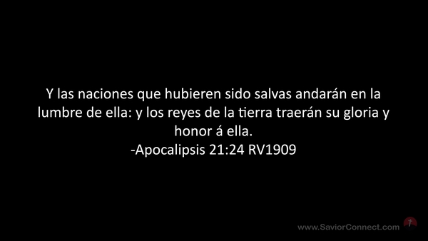 Y las naciones que hubieren sido salvas andarán en la lumbre de ella: y los reyes de la tierra traerán su gloria y honor á ella. -Apocalipsis 21:24 RV1909