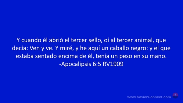 Y cuando él abrió el tercer sello, oí al tercer animal, que decía: Ven y ve. Y miré, y he aquí un caballo negro: y el que estaba sentado encima de él, tenía un peso en su mano. -Apocalipsis 6:5 RV1909