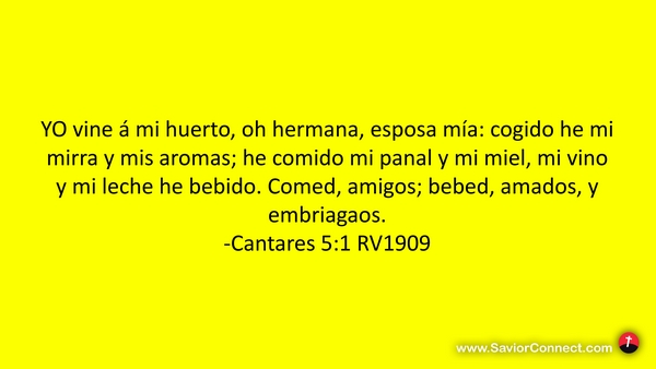 YO vine á mi huerto, oh hermana, esposa mía: cogido he mi mirra y mis aromas; he comido mi panal y mi miel, mi vino y mi leche he bebido. Comed, amigos; bebed, amados, y embriagaos. -Cantares 5:1 RV1909