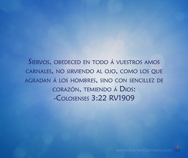 Siervos, obedeced en todo á vuestros amos carnales, no sirviendo al ojo, como los que agradan á los hombres, sino con sencillez de corazón, temiendo á Dios: -Colosenses 3:22 RV1909