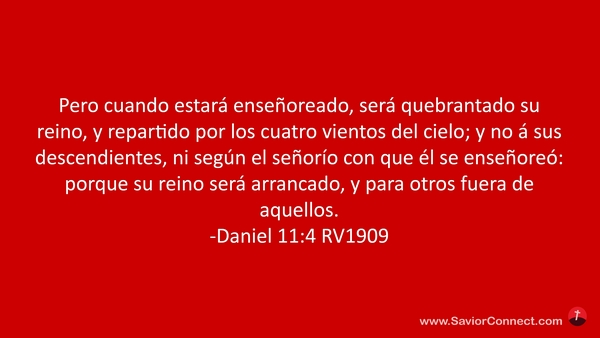 Pero cuando estará enseñoreado, será quebrantado su reino, y repartido por los cuatro vientos del cielo; y no á sus descendientes, ni según el señorío con que él se enseñoreó: porque su reino será arrancado, y para otros fuera de aquellos. -Daniel 11:4 RV1909