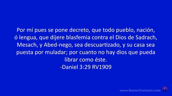Por mí pues se pone decreto, que todo pueblo, nación, ó lengua, que dijere blasfemia contra el Dios de Sadrach, Mesach, y Abed-nego, sea descuartizado, y su casa sea puesta por muladar; por cuanto no hay dios que pueda librar como éste. -Daniel 3:29 RV1909