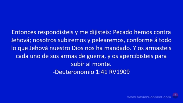 Entonces respondisteis y me dijisteis: Pecado hemos contra Jehová; nosotros subiremos y pelearemos, conforme á todo lo que Jehová nuestro Dios nos ha mandado. Y os armasteis cada uno de sus armas de guerra, y os apercibisteis para subir al monte. -Deuteronomio 1:41 RV1909