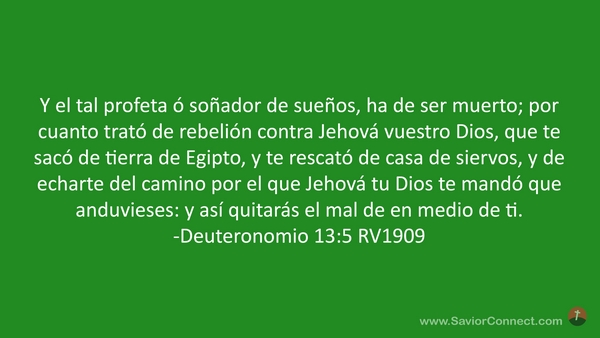 Y el tal profeta ó soñador de sueños, ha de ser muerto; por cuanto trató de rebelión contra Jehová vuestro Dios, que te sacó de tierra de Egipto, y te rescató de casa de siervos, y de echarte del camino por el que Jehová tu Dios te mandó que anduvieses: y así quitarás el mal de en medio de ti. -Deuteronomio 13:5 RV1909