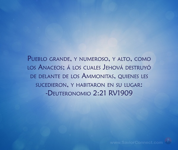 Pueblo grande, y numeroso, y alto, como los Anaceos; á los cuales Jehová destruyó de delante de los Ammonitas, quienes les sucedieron, y habitaron en su lugar: -Deuteronomio 2:21 RV1909