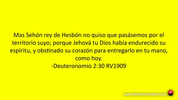 Mas Sehón rey de Hesbón no quiso que pasásemos por el territorio suyo; porque Jehová tu Dios había endurecido su espíritu, y obstinado su corazón para entregarlo en tu mano, como hoy. -Deuteronomio 2:30 RV1909