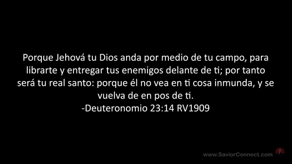 Porque Jehová tu Dios anda por medio de tu campo, para librarte y entregar tus enemigos delante de ti; por tanto será tu real santo: porque él no vea en ti cosa inmunda, y se vuelva de en pos de ti. -Deuteronomio 23:14 RV1909