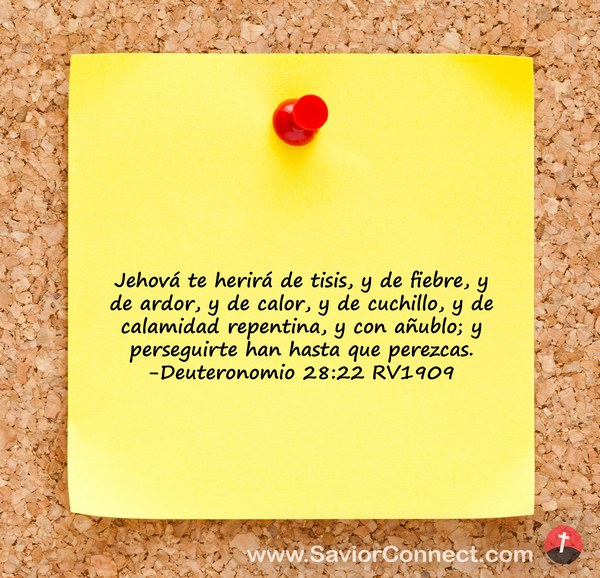 Jehová te herirá de tisis, y de fiebre, y de ardor, y de calor, y de cuchillo, y de calamidad repentina, y con añublo; y perseguirte han hasta que perezcas. -Deuteronomio 28:22 RV1909