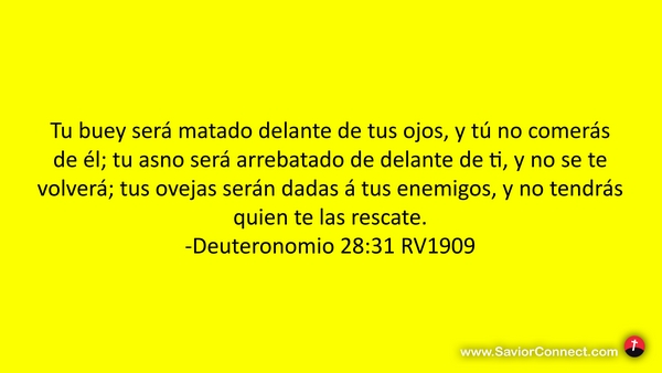 Tu buey será matado delante de tus ojos, y tú no comerás de él; tu asno será arrebatado de delante de ti, y no se te volverá; tus ovejas serán dadas á tus enemigos, y no tendrás quien te las rescate. -Deuteronomio 28:31 RV1909