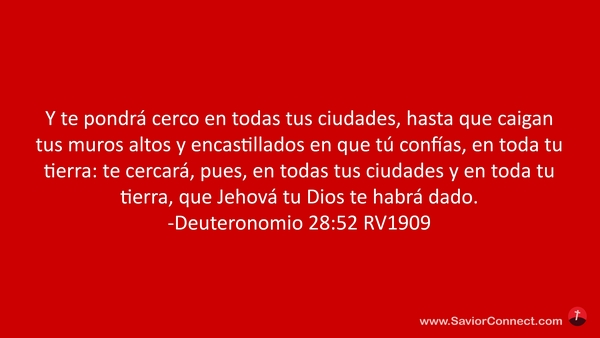 Y te pondrá cerco en todas tus ciudades, hasta que caigan tus muros altos y encastillados en que tú confías, en toda tu tierra: te cercará, pues, en todas tus ciudades y en toda tu tierra, que Jehová tu Dios te habrá dado. -Deuteronomio 28:52 RV1909