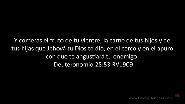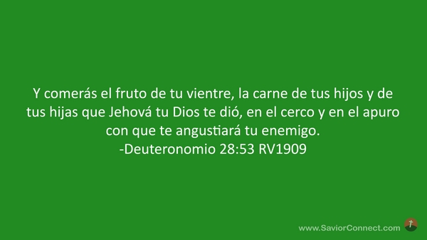 Y comerás el fruto de tu vientre, la carne de tus hijos y de tus hijas que Jehová tu Dios te dió, en el cerco y en el apuro con que te angustiará tu enemigo. -Deuteronomio 28:53 RV1909