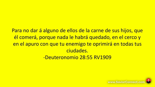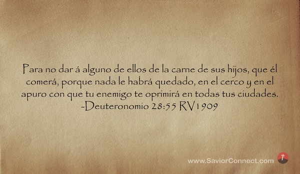 Para no dar á alguno de ellos de la carne de sus hijos, que él comerá, porque nada le habrá quedado, en el cerco y en el apuro con que tu enemigo te oprimirá en todas tus ciudades. -Deuteronomio 28:55 RV1909